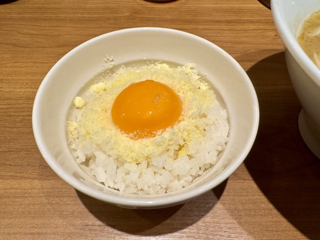 スープをシメにチーズリゾット化すべし、というのもベジポタ系ラーメン屋では定番。ライス小であれば、300円で上記セットを作成できる。卵黄50円は安い。