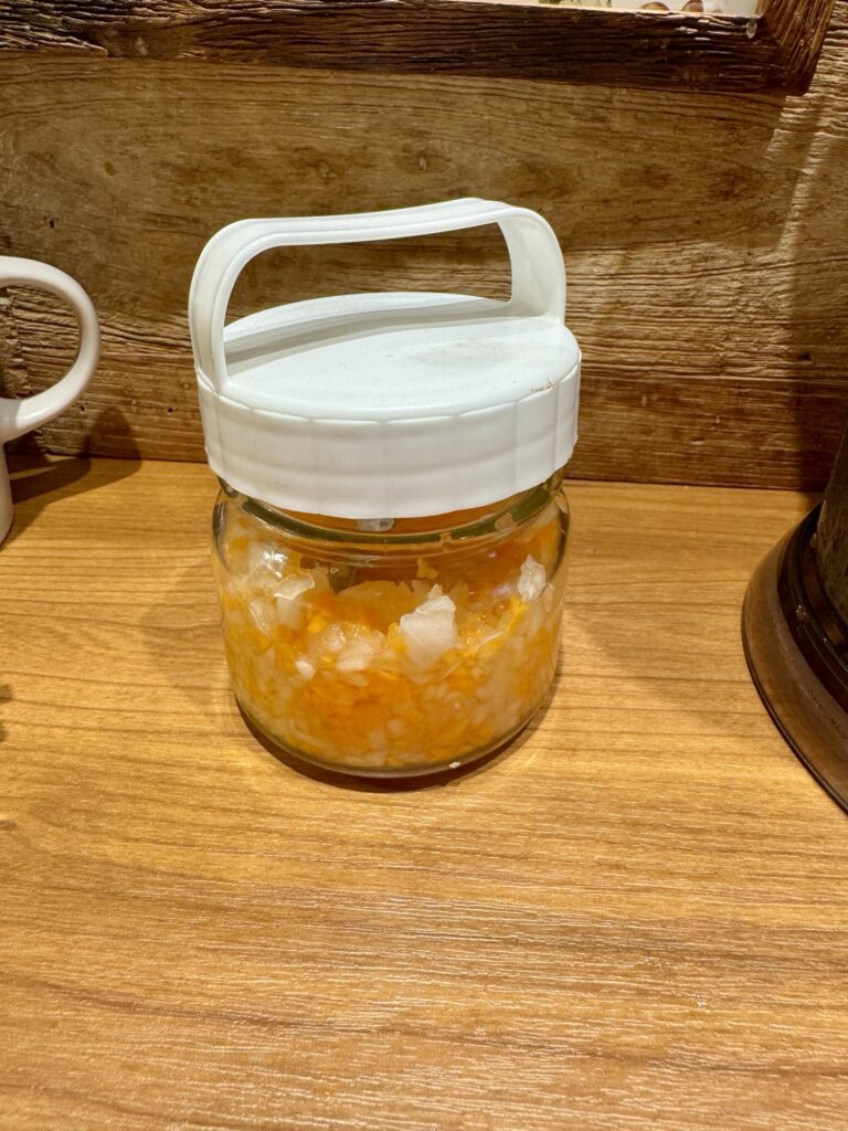 野菜感を全面に押し出しているラーメン屋だからだろうか、人参玉葱のピクルスのトッピングは無料。味のアクセントとしては最適。