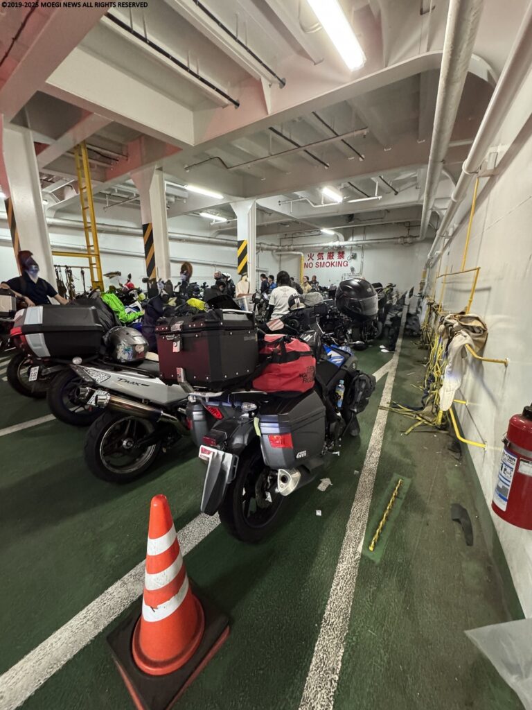 2025年9月2日(火)のさんふらわあでのバイク込み具合はほぼ満車状態であった。接岸したので、バイクまで移動し準備を進める。この時間が一番蒸し暑い。雨が降っているため、雨具を装備するか悩むが船倉があまりにも暑いので脱ぐ。