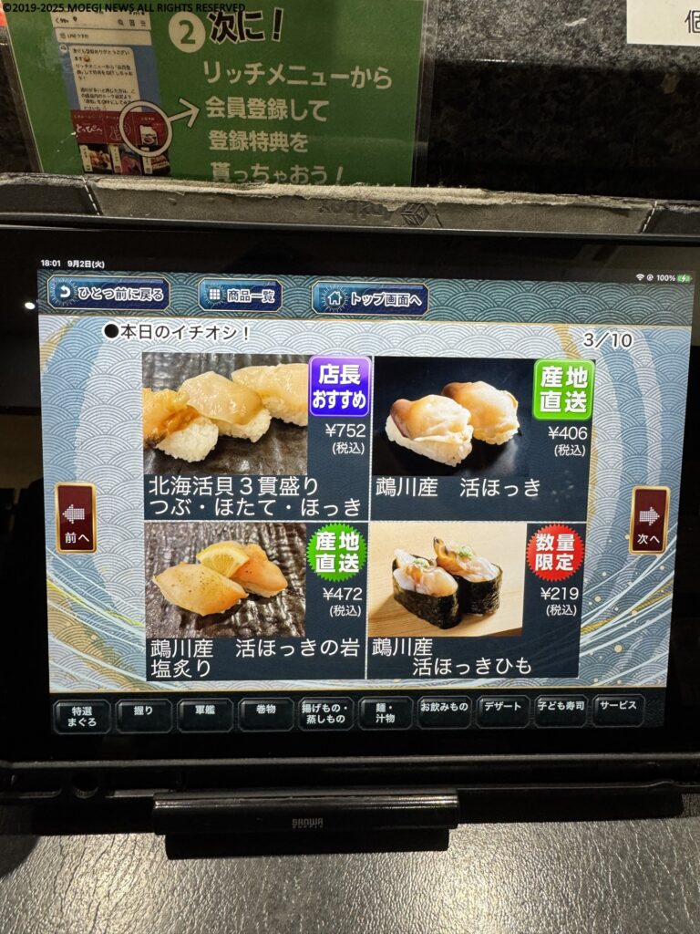 岩見沢イオンの中に入っている回転寿司「とっぴ~」に18時過ぎに入店。平日ということもあり店内はガラガラ。地のもの中心に一気に10皿ほど平らげる。この瞬間が本日のクライマックスだった。