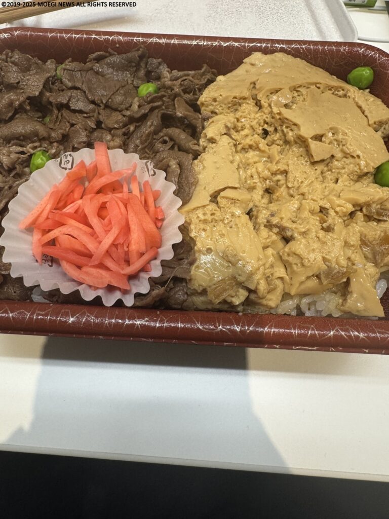 しかしながら、タレが染み込んだ黒毛和牛が非常に滋味深く、玉子も出汁が効いていてとにかく箸が止まらない。若干小ぶりなことを除けば、旨い、早く食べれるを完璧に実現できるある種理想のロケ弁でもある。
